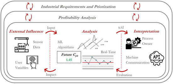 As a consequence of the predominant focus of applied ML technologies on optimizing decision processes and their outcomes, the interpretation and causation of predictive elements have been increasingly overlooked [16]. This characterization has led to the inclination to develop intricate algorithms known as black-box models, which only permit limited inferences about algorithmic decision making. Only in recent years have endeavors to develop interpretable models become discernible. These efforts are encompassed by the comprehensive term “explainable Artificial Intelligence” (xAI) [17]. Given the importance of interpreting the results, xAI methods contribute to an increase in information within the context of process quality. In order to situate industrial ML applications in a suitable environment, companies must consider not only information gains and knowledge transfer but also various concepts for the industrial application of decision-supporting ML in quality management for operational integration [18]. The primary focus lies in functionality, although the economic benefit can only be partially measured and the integration costs are a critical determinant of the technology’s success. With the shift towards digitized corporate environments, production companies are confronted with the decision of which decision-making processes should be supported by ML and what requirements should be met by the application [19].
