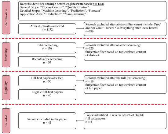 The search itself is conducted based on various combinations of terms, which are within the context of PPC. However, prior to this, Vom Brocke et al. [22] highlighted the impact of selecting predefined search terms on the outcomes. In order to ensure a more unbiased search, blocks are categorized using keywords and all combinations from these blocks are inputted as search patterns. This methodology serves to minimize the error rate in terms of identifying relevant work. For this particular study, the search terms are divided into three combination blocks. Each block is assigned to a category that holds significance for the process index. The first block focuses on fundamental topics, such as “Process Control” and “Quality Control”. This is followed by a secondary determination of the specific focus of the research. Given the distinct characteristics, two blocks are utilized for this purpose—one describing the application and the other categorizing the type, thus thematically classifying the application. The first subordinate block employs the terms “machine learning”, “prediction”, and “forecast”. The final block completes the search with the terms “production” and “manufacturing”. Consequently, a total of twelve different combinations are generated. The search encompasses publications from the past ten years. The quantitative outcome of the literature search reveals a total of 1398 papers retrieved.