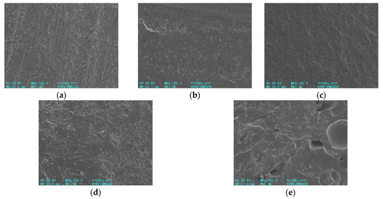 Figure 7 shows the tensile stress–strain curves of materials with different nano-silicon dosages. The stress–strain curves of the modified polyurethanes can be divided into three stages: dense deformation (Stage I), elastic deformation (Stage II), and plastic deformation (Stage III). As nano-silicon is added, the initial slope of the stress–strain curve increases. However, it decreases when the dosage exceeds 5%. The material undergoes elastic deformation under low stress when the strain is less than 0.01. In this phase, the tensile stress–strain curve (section 0–a) is linear. This minimal deformation occurs due to the transient forces applied, causing changes in bond lengths and angles within the molecular chains of the material [46]. After point a, the specimen enters a plateau period (segment a–b). The plateau length decreases with the addition of nano-silicon but increases again when the dosage exceeds 5%. This change occurs because the hardness of the material increases with more nano-silicon, which fills the matrix space, turning many soft segments into “hard segments”. During this plateau period, the stress increment/strain increment ratio remains constant. The tensile force makes the internal structure denser. Beyond point b, the stress–strain curve becomes roughly linear elastic. Here, a small strain increment causes a larger stress increment. As the nano-silicon dosage increases, the slope in the linear elastic phase also increases. Beyond point c, the strain continues to increase. The ratio of stress increment to strain increment decreases, and the specimen enters the plastic deformation stage (Stage III). At this stage, the molecular chain deforms due to the movement of the chain segments [39]. Macroscopically, this is observed as the specimen elongating under increased tensile force. In the plastic deformation stage (Stage c–d), the slope of the stress–strain curve gradually decreases, making the curve more linear. This indicates a transition from elastic to plastic behavior. Near point d, the strain reaches the ultimate bearing capacity of the molecular chain, leading to a sudden fracture of the specimen as it reaches the ultimate stress. As shown in Figure 8, at 2% and 5% dosages, the tensile fracture surface of the material is smooth. The appropriate amount of nano-silicon enhances the material’s hardness and tensile properties. However, as the dosage increases, the fracture surface becomes rough and uneven. Figure 8d,e show that vesicles inside the material gradually increase, leading to a decrease in tensile properties.