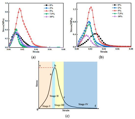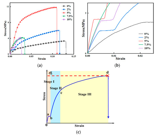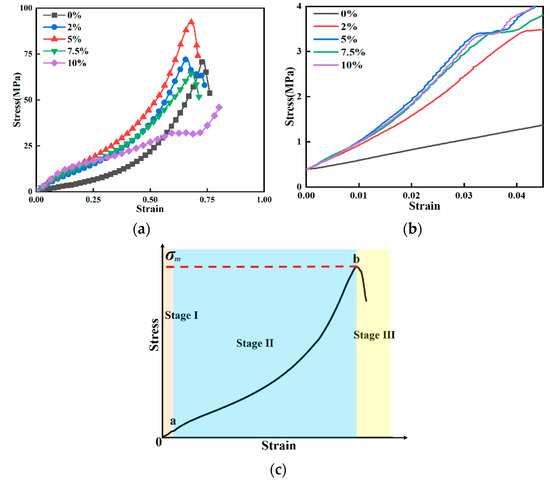 Compressive stress–strain curve for materials with different dosages. (a) Measurement curve; (b) Stage I; (c) schematic curve.