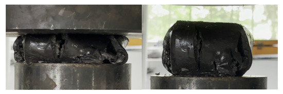 Figure 3 shows the compressive stress–strain curves of the modified polyurethane at different dosages. The results show that the stress–strain curves of the modified polyurethane prepared in this study are nonlinear. The compression process can be roughly divided into three stages: the elastic stage (Stage I), the elastic-plastic stage (Stage II), and the destructive stage (Stage III). The initial slope of the stress–strain curve of the material increases gradually with the increase in nano-silicon dosage and starts to decrease when it exceeds 5%, as shown in Figure 3b. In the first stage, the stress–strain curve of the material is approximately linear. The material undergoes elastic deformation when it is subjected to an instantaneous force (strain less than 0.04), and the internal structure is compressed to become dense. The strain in this process is very small. The elastic-plastic stage (Stage II) begins after passing point a. The slope of the stress–strain curve becomes smaller and subsequently becomes more linear. The slope of the stress–strain curve then gradually increases. During the elastic-plastic phase, the overall trend of the ratio of the stress increment to the strain increment becomes gradually larger, and the stress–strain curve transforms from roughly linear to nonlinear. In this stage, the material is subjected to vertical loading force, and the volume begins to spread around, making the vertical stress disperse in all directions. At this time, the material absorbs a large amount of energy through deformation. When the stress reaches point b, it reaches the limit compressive strength, and the material enters the destruction stage (Stage III). At this time, the material suddenly emits a crisp fracture sound, and instantaneous vertical cracks appear on the material’s surface, rapidly expanding in a rugby ball shape to both sides. This results in a rapid decline in the wall’s cracking stress, leading to the specimen’s destruction. With continuous loading, the material will continue to be compressed, and the stress will increase again after the drop. At this point, the material is pressed into a shape resembling a cake and no longer holds any significance, so the test is ended when the stress reaches 80% of the peak value. It is worth noting that the composites with a nano-silicon dosage of 5% exhibited higher strength. This is due to the fact that the right amount of nano-silicon is better dispersed homogeneously and rubs against the polyurethane material [47]. This not only increases the energy dissipation and damping ratio but also stores more deformation energy than the matrix material [48]. Therefore, after unloading at the damage stage, the material still has some deformation recovery ability, as shown in Figure 4. All other dosages are completely destroyed at this point and cannot recover from a certain amount of deformation as the 5% dosage can.