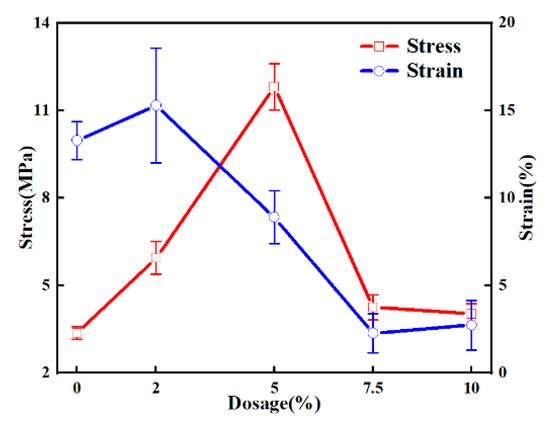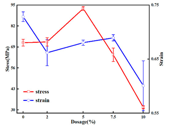 As shown in Figure 12a, the shear strength of the material gradually increases with the increase in nano-silicon dosage. When the dosage is low, the filling degree of the raw material is low, which leads to the uneven performance of the material injected into the cracks and limited enhancement of the shear strength. The shear strength is maximized when the dosage is 5%. Above 5%, due to the agglomeration effect of nanoparticles, the material contains air bubbles. This results in a gradual decrease in shear strength. From Figure 12b, it can be seen that the trend of the ultimate shear strain of the material is basically the same as that of the shear strength. At a small amount (2%) of addition, it leads to a small decrease in the ultimate shear strain. At a dosage of 5%, the ultimate shear strain reaches a maximum. Above 5%, the ultimate shear strain begins to decrease substantially.