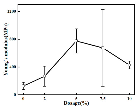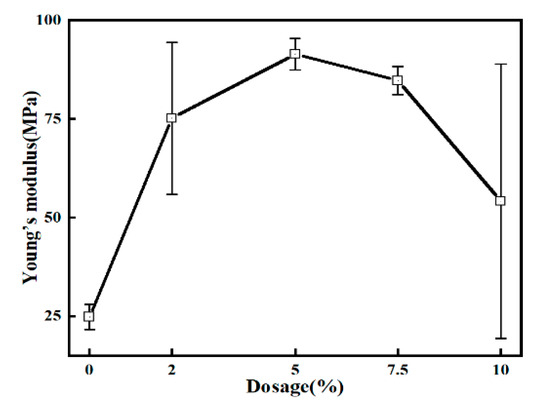 In the tensile test, the addition of nano-silicon enhanced the tensile strength and Young’s modulus of polyurethane. The tensile strength of the modified material was gradually enhanced at dosages of 2% and 5%. The tensile strain decreased with increasing dosage due to the ability of nanoparticles to enhance the hardness of the material. At a 5% dosage, the tensile strength increased by 257.6%, while the strain loss was only 32.6%. The increase in dosage to 7.5% and 10% resulted in a drastic decrease in tensile strength due to the excessive incorporation of nano-silicon, which resulted in a much lower tensile strain, although it was higher than that of the substrate. Despite the decrease in tensile strength, the Young’s modulus of the material remained higher than that of the substrate in the low-strain range.