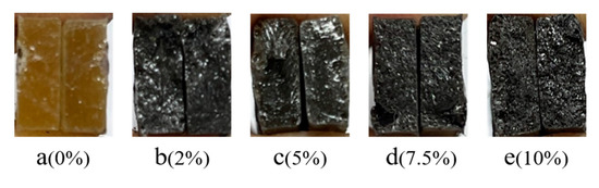 For scanning electron microscopy tests, the cured material with different dosages was cut into 1 cm × 1 cm × 0.5 cm blocks using a razor blade. The samples were coated with gold using an SBC-12 sputtering apparatus before observation. The surface of the samples was then observed under vacuum conditions using a KYKY-EM6200 electron microscope, and representative images were selected and saved for analysis.