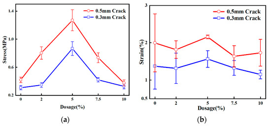 It can be seen from Figure 12 that as the crack opening increases from 0.3 mm to 0.5 mm, the general trend of the shear strength and ultimate strain of the specimens showed an increase. This may be due to the fact that as the crack width increases, it makes the permeability in the crack gradually increase. At the same time, the amount of polyurethane infusion becomes more, and the material is able to fully contact the concrete wall, which makes the bond stronger. It was also noted that at a dosage of 10%, the shear strength of the 0.3 mm crack specimens was slightly higher than that of the raw material, and the shear strength of the 0.5 mm crack specimens was almost the same as that of the 0% material. This indicates that although the agglomeration effect occurs when nanomaterials are overdosed, the incorporation of nano-silicon still gives the material a certain bonding force.