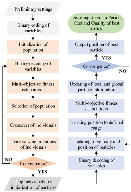 The improved GA can be utilized for multi-objective preliminary optimization through binary coding of construction variables, population initialization, binary decoding, multi-objective fitness calculation, population selection, individual crossover, individual mutation, etc. It is recommended to use the mutation rate over time to avoid falling into a local optimum. A few best-performing individuals are selected as initial particles for PSO with chaotic perturbations. Then, the PSO-based multi-objective optimization is completed sequentially by binary decoding, updating particle positions, constraining particles, multi-objective fitness calculation, and updating particle information. Finally, the best solution for a construction project can be obtained by decoding the optimal particle, as shown in the last two steps in Figure 1. The pseudo code for the proposed GA-PSO is shown in Algorithm 1, and the validation is performed by four different construction projects in Section 3.