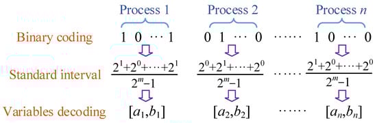 In this study, a hybrid GA-PSO method is proposed for multi-objective optimization of construction projects. GA solves optimization problems by mimicking nature’s eutrophication. Using binary coding to represent the construction duration of each process, cost and quality can be obtained according to Equations (2) and (3). Figure 2 displays the coding and decoding of the construction project, where m denotes the binary length, and a and b denote the lower and upper limits of the construction parameter, respectively. Each individual in the population is represented by a string of binary symbols. Optimal population is eventually obtained by repeated selection, crossover, and mutation of individuals.