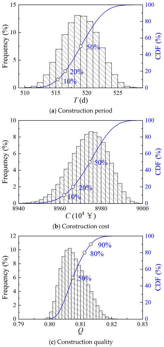 The construction period ranges from 510 to 525 days, the cost ranges from ¥8.94 × 107 to ¥9 × 107, and the quality ranges from 0.80 to 0.82. Approaching Gaussian distributions can be found for the three objectives. Construction period and cost should be as low as possible, and quality should be as high as possible. From a probabilistic point of view, the 50%, 20%, and 10% quartiles for construction period and cost, as well as the 50%, 80%, and 90% quartiles for quality, are informative and reflect the percentage of the current scheme’s objectives that is exceeded.