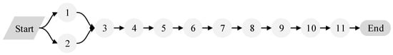 Table 3 displays the construction process of a subway project []. It contains a total of 11 processes, and the detailed construction network plan is shown in Figure 5. The subway tunnel project is located in the silty soil layer, coarse and medium sand layer, and pebble layer; the interval span is large; and the construction period is long. The tunnel is tunneled by a mud–water shield machine and is passed through by a two-lane operation. The construction of the tunnel’s left-lane cut-through is taken as a research object.