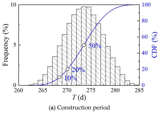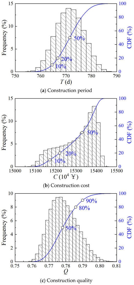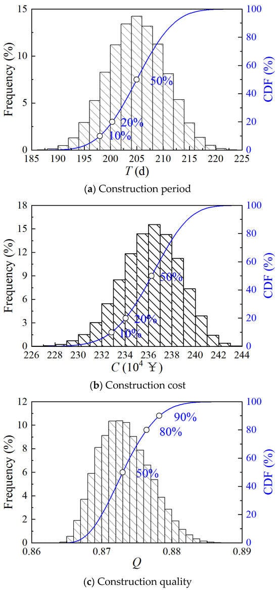 A Monte Carlo simulation was carried out 10,000 times for Case 1, and the cumulative distribution function (CDF) of the three objectives of the construction period, cost, and quality was plotted, as shown in Figure 4.