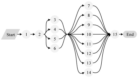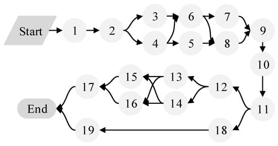 Table 7 displays the construction process of a company’s office building []. The building is a three-story brick structure, and the construction network plan is shown in Figure 9, consisting of 19 construction processes. The quality scores and weighting coefficients are offered by 10 experienced program managers. Detailed construction parameters are shown in Table 8.