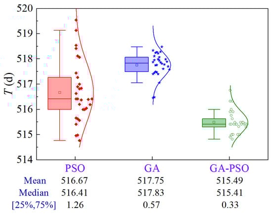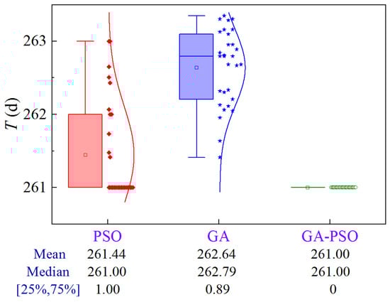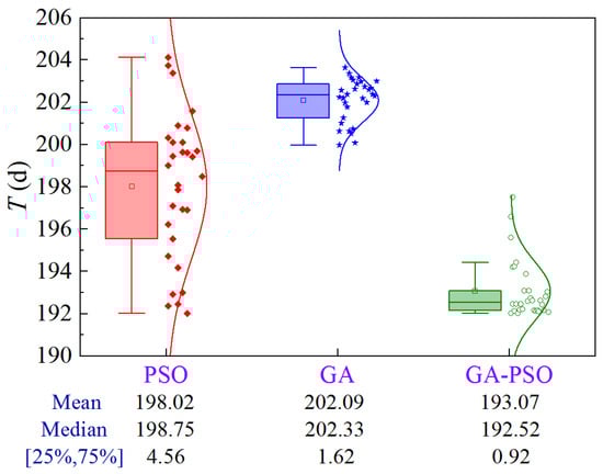 Figure 26 illustrates the uncertainty analysis for Scheme 3 of Case 3. The upper limit of the construction period and cost are 268.4 d and ¥2.492 × 106, respectively. The GA-PSO algorithm can provide the best quality in terms of mean and median values. In addition, volatility is reduced by 55.9% compared to PSO.
