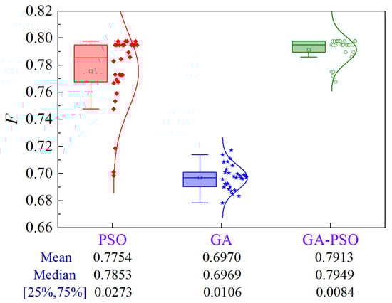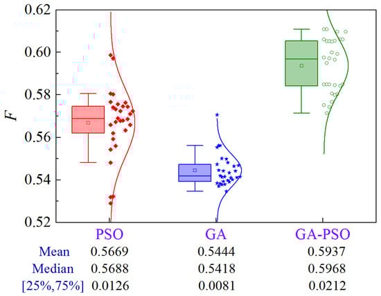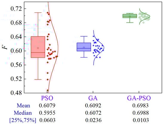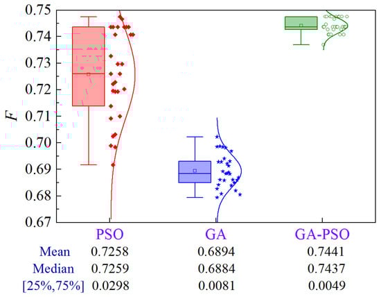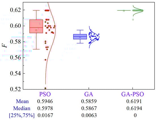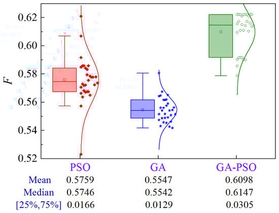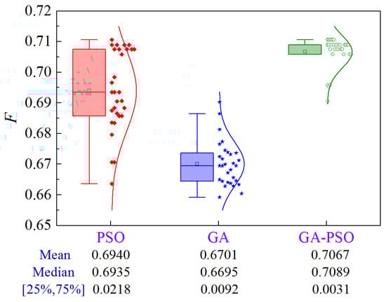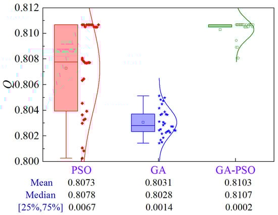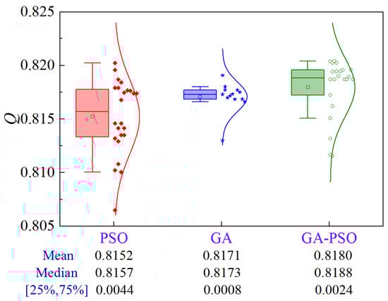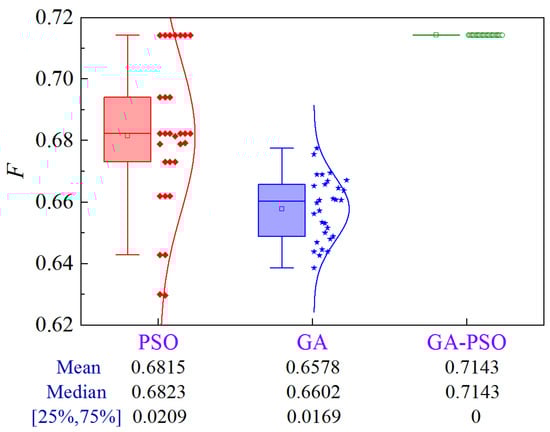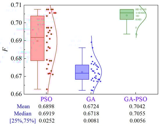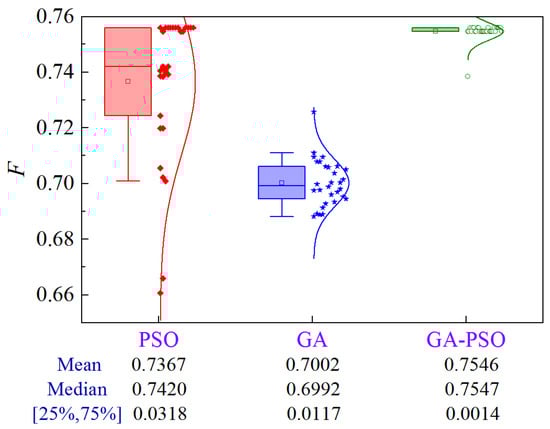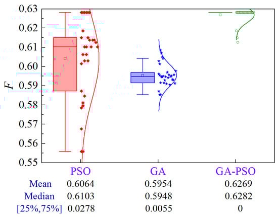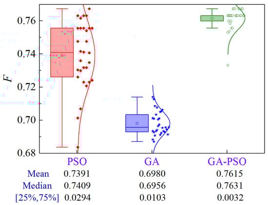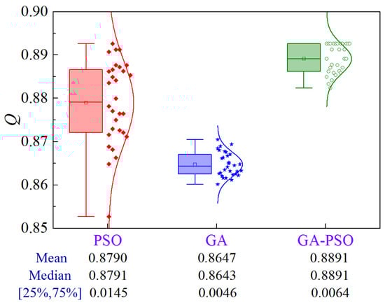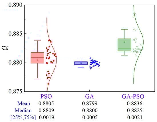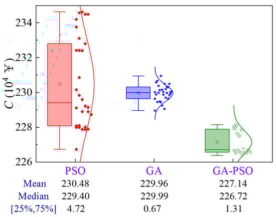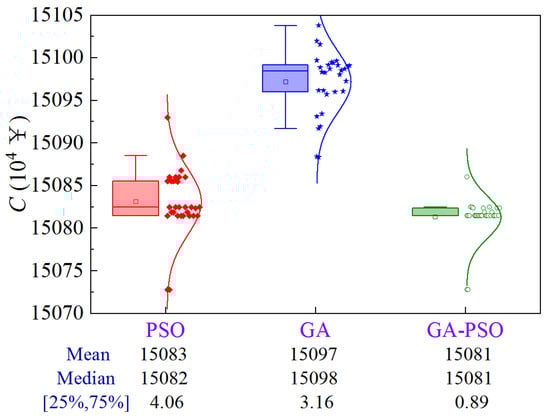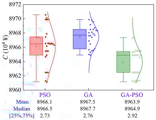 The uncertainty analysis for Scheme 6 of Case 3 is illustrated in Figure 29. Compared to PSO and GA, the GA-PSO algorithm improves the mean and median by 2.0% and 13.5%, and 1.2% and 14.1%, respectively, while decreasing the volatility by 69.2% and 20.8%, respectively.