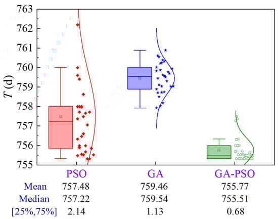 The uncertainty analysis for Scheme 6 of Case 4 is illustrated in Figure 35. Compared to PSO and GA, the GA-PSO algorithm improves the mean and median by 14.9% and 14.6%, and 17.4% and 15.1%, respectively, while decreasing the volatility by 82.9% and 56.4%, respectively.