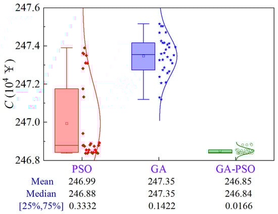 Figure 27 illustrates the uncertainty analysis for Scheme 4 of Case 3. Compared to PSO and GA, the GA-PSO algorithm enhances the mean and median by 3.0% and 9.1%, and 3.0% and 9.7%, respectively, while decreasing the volatility by 89.1% and 68.9%, respectively.