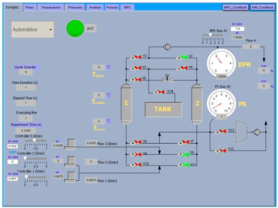 This paper presents a case study that addresses these gaps in the current knowledge of PSA control. The case study focuses on a laboratory PSA process, the Micro850 PLC, and the Modified Takagi–Sugeno–Kang-based MPC (MTSK-MPC) []. This PSA is a compact unit that separates gas mixtures of carbon dioxide (CO2) and methane (CH4). This PLC model is a general purpose industrial hardware used in modular process skid packages and is a representative example of an automation system of PSA units. The MTSK-MPC is a recently introduced MPC algorithm, well-suited for PLC implementation as it requires just the programming languages and function blocks from the IEC-61131-3 automation standard [] and includes memory-reducing features through fuzzy logic rules. Therefore, this paper’s main contribution is the application of the MTSK-MPC algorithm to a PSA process, which provides the means to investigate and implement computationally feasible MPC designs in PLCs.