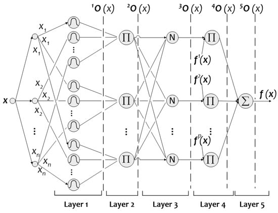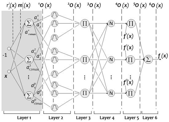 where is the output vector of the sixth layer, is the element of the fourth layer’s output vector, corresponding to the normalized weight of rule , and is the element of the fifth layer’s output vector, corresponding to the respective local function of rule .