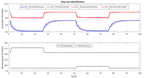 After comparing the outputs of the simulated process with the outputs of the transfer functions identified in Table 5, the mean absolute percentage error (MAPE) for CH4 purity and CO2 recovery was 2.1618% and 0.6273%, respectively. Note that the estimated transfer function gains are negative. That is, around the operating point used, increasing the feed or rinse time leads to a decrease in CH4 purity and CO2 recovery at the process outlet, as shown in Figure 3.