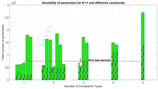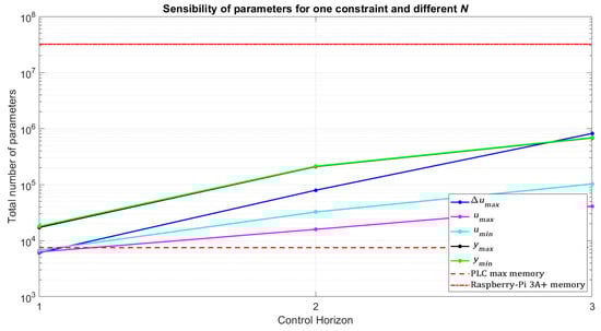 Observe in Figure 4 the results from different single-type constraints, which exhibit similar behaviors. As the prediction horizon increases, the MTSK-MPC exponentially increases the required parameter numbers. Additionally, input and input variation constraints result in fewer parameters compared to output constraints. This figure also shows the maximum memory capacity of the Micro850 in the red-dashed line and the memory of a standard Raspberry-Pi® 3 A+ micro-computer in the red-pointed line, assuming that all parameters require 16-bit floating-point variables. Considering such a limit, only three cases are embeddable in this PLC, which involve single input constraints and a unitary control horizon in the MPC formulation.