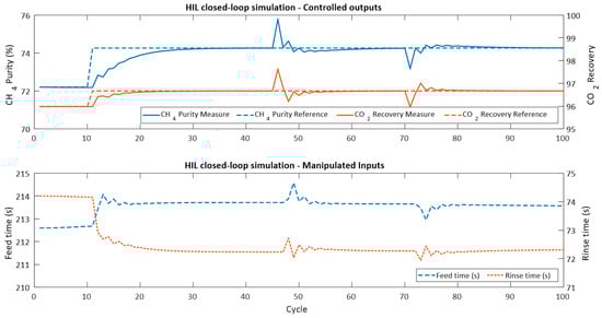 The MTSK-MPC implemented into the Micro850 tracked setpoint changes and rejected input disturbances. In addition, the MTSK-MPC absolute error difference between the PLC-based in the HIL simulation and the PC-based in the SIL simulation was negligible. Finally, the processing time of the MTSK-MPC in the Micro850 is about 100 ms, which is fast enough to control the under-studied PSA dynamics. The successful implementation of the MTSK-MPC into the Micro850 and the results obtained in the HIL simulation form the basis for future work to control the physical laboratory PSA unit of LSRE. In this scenario, future work should consider: (i) the execution time of the identification step tests, since the 100 cycles will result in more than 8 h of experiments, (ii) the PSA process without simplifications assumed in the mathematical model, which may present stronger nonlinear behavior than the simulated process, (iii) the effects of disturbances in key process variables, including feed flow rates, feed flow concentrations, column pressure, and column temperature, among others.