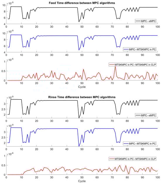 Absolute error difference over time between the MPCs outputs: (Top) Feed time and (Bottom) rinse time.