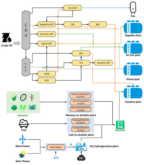 In this study, a multi-feedstock fuel-type modern refinery is designed to optimize the refinery’s profitability through the implementation of a comprehensive LP model spanning the entire facility. The benchmark process flow of the refinery is depicted in Figure 1. The model integrates conventional refinery units with alcohol production plants. Within the conventional refinery section, crude oil undergoes initial separation in the distillation unit, which includes both atmospheric and vacuum distillation for preliminary crude oil fractionation based on varying temperatures and pressures. The pre-separated crude oil is then processed in secondary units for extensive treatment such as hydrogenation, decarbonization, and cracking [51]. These units encompass processes such as gas processing, naphtha hydrogenation, catalytic reforming, benzene extraction, jet fuel and diesel hydrogenation, vacuum residue hydrogenation, delayed coking, hydrocracking, catalytic cracking, and gasoline refining units. The outputs from these secondary processing units are blended in dedicated blending pools to produce refined products such as naphtha, gasoline, aviation fuel, and diesel. The alcohol production plants include biomass fermentation, coal gasification, and CO2 hydrogenation processes powered by renewable power.