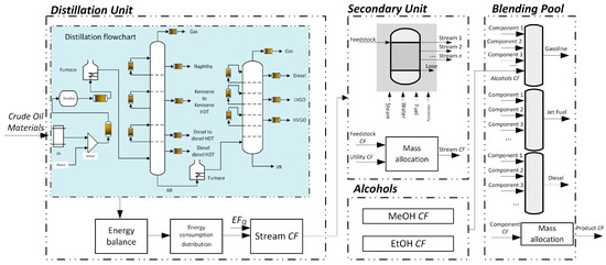 As illustrated in Figure 3, This study focuses on assessing the gasoline carbon footprint within the refinery scope and establishes a unified evaluation framework that encompasses the carbon footprint generated, transferred, and blended throughout the processes of crude oil intake, distillation, secondary processing, and product blending. The evaluation framework does not consider the carbon emissions produced during the combustion of gasoline.