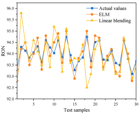 A dataset comprising 200 production records from a real-world refinery was utilized as the raw data to train the developed ELM model. The trained model’s prediction accuracy was validated using a test set. Simultaneously, the linear blending model, which is the current mainstream method, was also employed for predicting the RON of gasoline blends for comparison with the ELM model. In the evaluation of machine learning models, the choice of appropriate error metrics is pivotal for accurately assessing predictive performance. The Mean Absolute Error (MAE), functioning as an unbiased estimator, effectively captures the average magnitude of discrepancies between predicted and observed values, particularly adept in contexts involving outliers or noisy data. Meanwhile, the Mean Squared Error (MSE) and Root Mean Squared Error (RMSE) prioritize squared errors, imposing heightened penalties on larger deviations, thereby suitable for rigorously evaluating model accuracy [50]. The Coefficient of Determination (R2), quantifying the proportion of variance in the target variable explained by predicted values, provides a robust measure for assessing model fit and generalization capabilities. The comprehensive application of these error metrics facilitates a thorough evaluation of predictive performance and practical applicability in real-world scenarios.