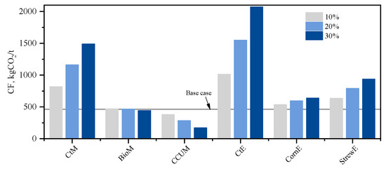 Based on the LP-ELM framework, the gasoline blending schemes and the overall plant carbon footprint transfer model for all technical routes were calculated, and the carbon footprints of gasoline are shown in Figure 6. A very notable feature is that the CtM and CtE processes, which originate from coal, have the highest gasoline carbon footprints. Specifically, the CtE process reaches the highest carbon footprint of 2072.89 kgCO2/kg at a 30% blending ratio. Although these two processes exhibit significant economic competitiveness, they also result in the most severe carbon emissions. This is primarily due to the mismatch between the hydrogen and carbon ratios in coal-based alcohols, which necessitates the consumption of CO through the water-gas shift unit to supplement hydrogen. This results in carbon wastage and emissions. The CtE production process, which predominantly uses an indirect method in the market, involves coal gasification to syngas, followed by MeOH synthesis, carbonylation to acetic acid, and subsequent hydrogenation to EtOH. The extended reaction pathway leads to a higher CF. Biomass MeOH has a slightly lower CF compared to the base case, while first-generation and second-generation bioEtOH have CFs slightly higher than the base case. The differences in raw material costs and technology maturity result in the second-generation bioEtOH technology currently being slightly inferior to the first-generation bioEtOH technology in both economic and environmental performance.