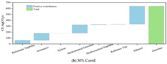 Furthermore, the gasoline CF can be analyzed based on the blending schemes and the CF data of the blending components. The gasoline CF blending data for two typical technical routes, CCUM and CornE, are presented in Figure 7. As shown in Figure 7a, seven components are used for gasoline blending: naphtha and raffinate from the catalytic reforming unit, aromatics, xylene, hydrotreated gasoline, hydrocracked naphtha, and MeOH. The figure illustrates the contribution of each component to the CF. The major contributions originate from the reforming unit, aromatics, and the hydrotreating unit. The reforming unit components contribute significantly to the CF due to their large volume, while the hydrotreating products have a high carbon intensity because of the extensive processing routes involved (starting from distillation and potentially passing through delayed coking, residue hydrotreating, catalytic cracking, and hydrotreating), which leads to a higher CF in the final product. CCUM, due to its ability to consume CO2 during production, possesses a negative carbon emission attribute, significantly reducing the gasoline CF when blended. Therefore, when blending alcohols to reduce the CF, maximizing the blending ratio is a favorable strategy. As illustrated in Figure 7b, CornE, which is considered to have the lowest CF among EtOHs, still contributes more than 47.9% to the gasoline CF when blended. This indicates that the high CF characteristic of EtOH makes its blending process non-conducive to carbon reduction and may instead increase environmental costs.