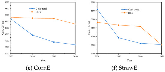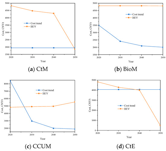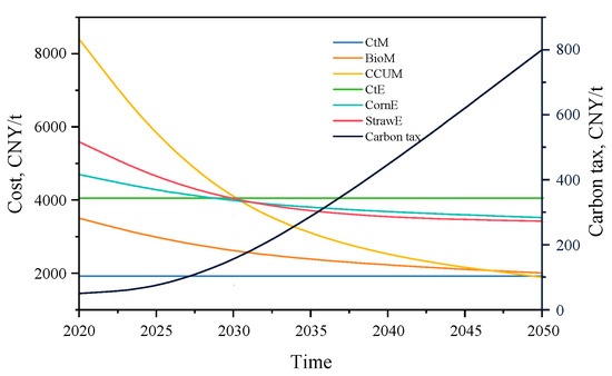 According to the proposed cost prediction model, the prices of biomass alcohols and CCUM were forecasted, and the results are shown in Figure 8. The future carbon tax trend in mainland China, as provided in the literature [51,69], was adopted for the long-term performance evaluation of the refinery. As illustrated in Figure 8, the costs of biomass MeOH and EtOH decrease with technological advancements and market expansion, particularly before 2035. Second-generation bioEtOH is expected to become cheaper than first-generation bioEtOH by around 2030. The production of StrawE avoids the resource waste associated with using food crops as raw materials by utilizing straw instead. This indicates that StrawE will surpass first-generation biomass MeOH comprehensively after 2030. The price reduction trend of CCUM is the most significant among all alcohols. Benefiting from the rapid decline in renewable electricity costs, CCUM is projected to become cheaper than bioEtOH by around 2030 and further decrease to 1887.6 CNY/t by 2050, making it the most cost-effective alcohol production route. The CtM and CtE processes are assumed to have constant costs. As other renewable energy routes develop, these processes will gradually lose their price advantage.