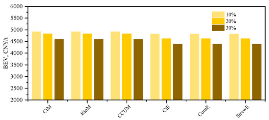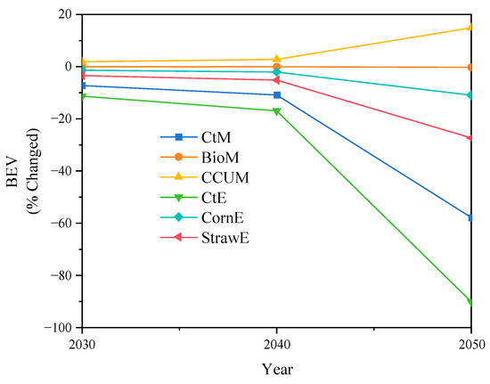 Under the projected future scenario of decreasing alcohol costs and increasing carbon taxes, the BEVs for refineries have been calculated and are shown in Figure 10. Overall, as time progresses, the BEVs for CtM, CtE, CornE, and StrawE exhibit a declining trend. This suggests that the high carbon intensity of these processes results in additional costs, making the cost requirements for raw materials more stringent. The BEV for BioM remains relatively stable because its carbon intensity is similar to that of gasoline, rendering it less susceptible to carbon taxes. Notably, the BEV for CCUM demonstrates an increasing trend in the future, indicating that blending CCUM is expected to become more profitable. Furthermore, this economic advantage is projected to expand over time.