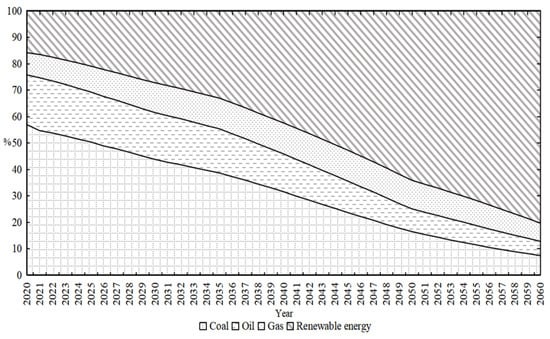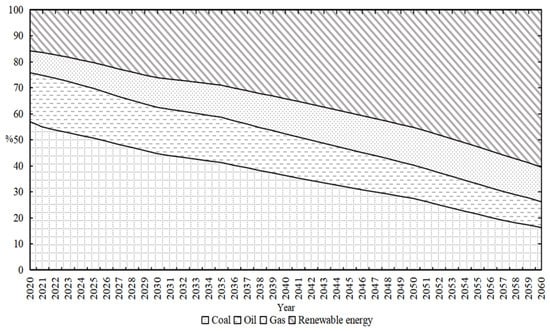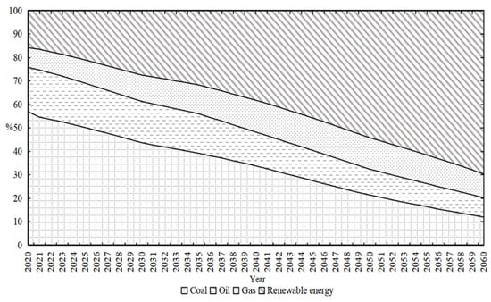 Table 6, and finds that the estimated proportions of coal, oil, natural gas, and clean energy in China in 2030 are 43.60%, 17.60%, 11.20%, and 27.60%, respectively. Compared with the low-speed development scenario, the proportion of clean energy is 1.40 percentage points higher. In 2040, the estimated proportions of coal, oil, natural gas, and clean energy in China are 33.70%, 14.40%, 13.60%, and 38.30%, respectively. At this time, the proportion of clean energy in the entire energy consumption structure will have increased; In 2050, the estimated proportions of coal, oil, natural gas, and clean energy in China are 21.30%, 11.00%, 13.40%, and 54.30%, respectively. The proportion of clean energy in the entire energy consumption structure will exceed that of petrochemical energy, further increasing the depth and breadth of energy system transformation. The estimated proportions of coal, oil, natural gas, and clean energy in China in 2060 are11.90%, 8.20%, 10.10%, and 69.80%, respectively. According to the results of the numerical simulation analysis in this paper, by 2060, the proportion of consumption of clean energy in China’s entire energy system will be close to 70%, while the proportion of consumption of fossil fuels such as coal, oil, and natural gas in the entire energy system will be maintained at around 30%. The transformation of the energy system from traditional fossil energy to clean energy is more obvious.