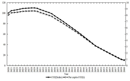 2 emission path from 2020 to 2060, this paper sets China’s 2020 (benchmark year) carbon emission index to 100. China’s 2021 carbon emission index is divided by the 2021 CO