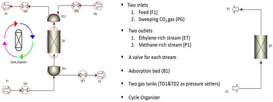 The design and operating concept of the hybrid PSA-TSA system for each of the investigated process scenarios were simulated using the Aspen Adsorption module. The operation in the adsorption separation unit consists of four steps in a cycle, namely (1) adsorption, (2) quick depressurization-purging of the gas components in equilibrium with the saturated sorbent, (3) desorption using sweeping gas, and (4) quick pressurization using the feed stream. The full cycle was simulated through which the feeding, pressurizing, adsorption, purging, heating, desorption purging, and cooling were implemented in the Cycle Organizer of Aspen Adsorption, as schematically presented in Figure 2.