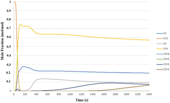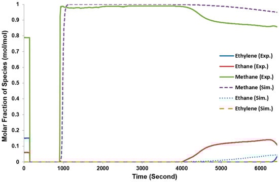 The predicted breakthroughs under the investigated designed specifications and configuration were studied and demonstrated (e.g., as shown in Figure 3) to follow similar trends as recorded experimentally. The typical composition of the gas stream exiting the adsorption column along the time, indicating the breakthrough of ethane and ethylene, can be seen in Figure 4.
