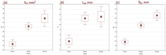 Boxplots of three quality indicators categorized by the superheat quartile: (a) surface area of the axial void (cavity) in the billet (So, mm2); (b) the length of internal cracks (Lw, mm); (c) deformation (rhombicity) of the billet (Dp, mm).