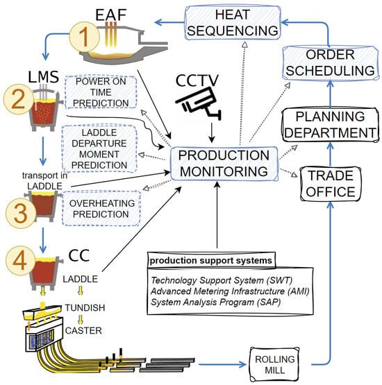 The elements of the system therefore include the following components: a production planning and scheduling system, which ensures the optimization of production plans; a system for monitoring the location of individual ladles in the melt shop hall; a system for monitoring process parameters and temperature; models for predicting casting time and energy consumption; and models for metal cooling during transport. This integrated system uses available, functioning data sources and knowledge in the plant, including measurement systems of devices (AMI—Advanced Metering Infrastructure), CCTV camera systems, technology support systems (SWT), SAP systems, and commercial data. The integration of these components and predictive models has made it possible to develop a production support system for the melt shop (Figure 2).