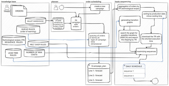 Regarding the optimization module, the inputs to the model are illustrated in Figure 4. These include: the order list from the SAP system; inventory levels from the SAP system; queue rules—rules for queuing resulting from mill retooling and defined by technologists; transition rules (rules for combining materials into sequences) defined in the knowledge base by technologists and mapped by the described system into graph form; and steelmaking rules defined by technologists from the melt shop that specify additional rules for ordering materials in the melting queue, the knowledge base on the maximum number of heats for a given material in a sequence, and the cooling time for the given material. The output of the model is the daily sequence plan for heats. Thus, one can determine: the number of heats per day, the melting time, and the degree of alignment of the actual plan with the ideal plan, as assessed by the lead technologist in terms of quality.