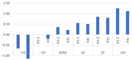 Energy consumption per 1 °C/min heating depending on the sequence order and the degree of reheating. H1-2 denotes the first or second heat in the sequence; H3 denotes the third and subsequent heats until the end of the sequence. The levels of reheating are marked as −25, −10, indicating heats whose initial temperature was above the LMS exit temperature—such heats required only stirring and refining, while subsequent levels were characterized by an increasing difference between the expected temperature and the initial temperature. Energy was measured in kW/1 °C/min.