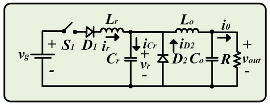The HW-ZCSQR buck converter (Figure 1) presents two different frequency networks, with the low network comprising the second-order low-pass filter ( and ) and the high network formed by the resonant tank ( and ). Additionally, active () and discrete (, ) switches achieve the modes of operation during a switching period, in which, for simplicity, a purely resistive load (R) is used for the mathematical evaluation.