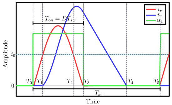 - For the time period –, the system operates in resonant mode with angular frequencyand resonant periodwith as the resonant frequency.Considering that , it is possible to conclude thatMoreover, since the time period – corresponds to the resonant period, it is obtained that