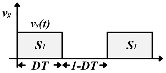 The circuit in Figure 1 presents a principal series switch ( and ), which performs unidirectional current and bidirectional voltage control. Therefore, during the switching period, the topology performs four different modes induced by the square signal illustrated in Figure 2, which correspond to the values of the parameters listed in Table 2, which were obtained from [9].