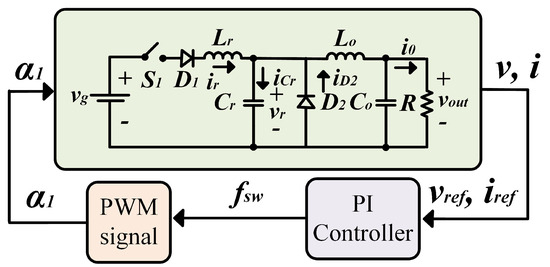 In this study, the possibility described above was implemented by considering the controller presented in Figure 4. In addition to the fact that this scheme is widely recognized as a reference to propose any alternative controller, the rationale behind this choice was that the simplest model-free structure of this scheme imposes a big challenge to achieve the desired performance since in its classical implementation, in order to deal with large load variations, it would be necessary to drastically adjust , which puts the soft-switching commutation at risk and leads to the result that voltage regulation can only be satisfied under restricted variations in the load.