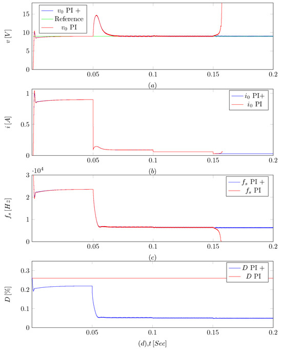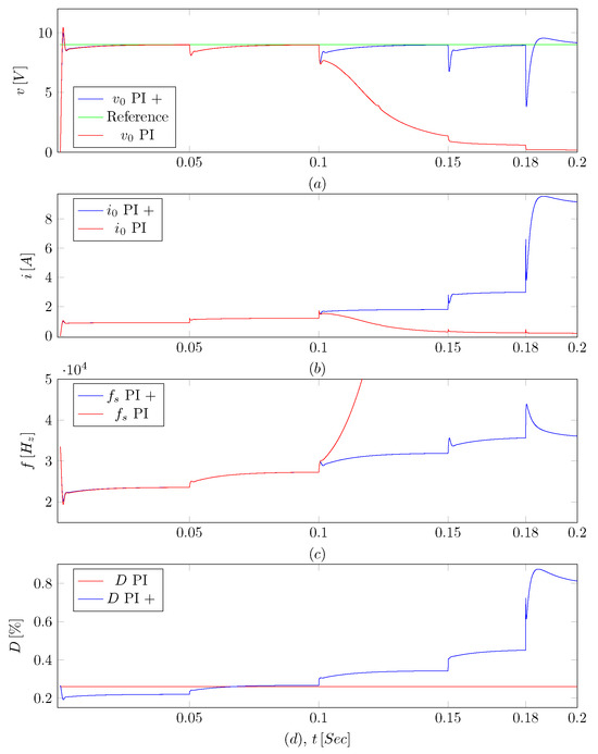 Concerning the maximum load supported by both the and controllers, Figure 9a shows the signal under increasing load resistance variations, as mentioned above. It can be noticed that both schemes achieved voltage regulation up to s, where the load was changed to . At this instant, the controller was not able to guarantee correct operation, in contrast to the scheme, which even for the load change introduced at s, achieved the desired regulation. Figure 9b–d complement this evidence, where it is important to remark on the last one, where it is clear how the proposed scheme achieved the control objective by adjusting the value of D. In this sense, presented an increase in the load resistance variation of more than one and a half times the maximum load allowed by .