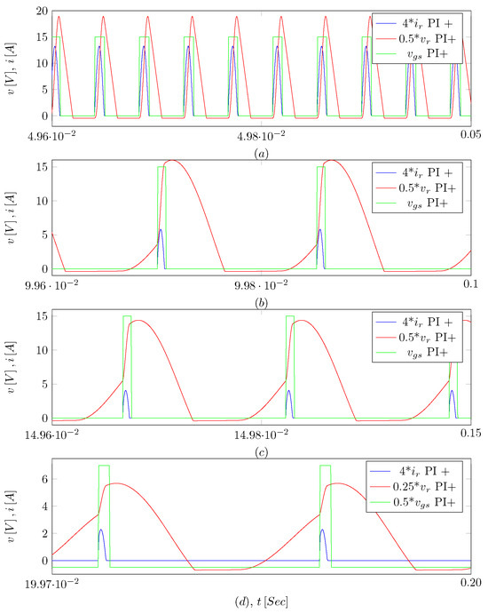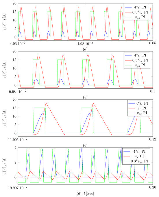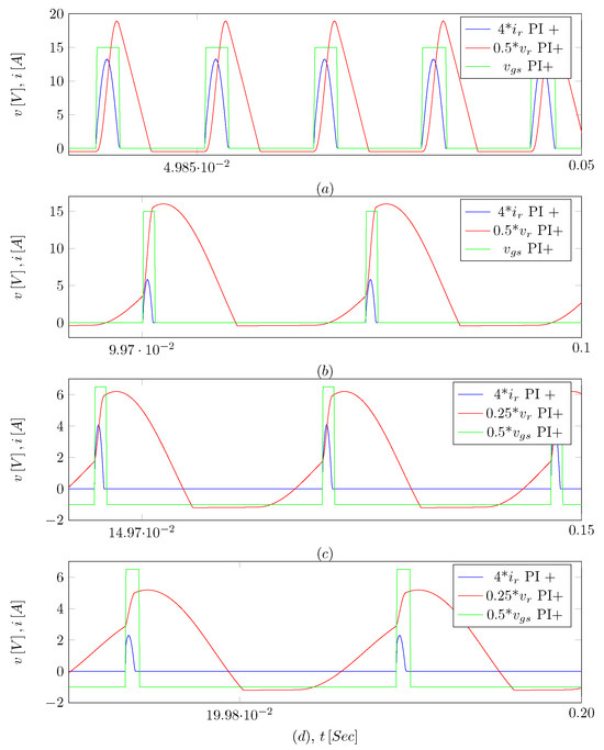 To complete the analysis under decreasing load resistance conditions, Figure 7 shows the (scaled) signals , , and , which were obtained under load conditions for the controller. Here, was the gate–source voltage applied to the MOSFET that corresponded to in the SIMSCAPETM environment. Figure 7a,b show the signals of the resonant tank under nominal load and , respectively. Under these conditions, it was possible to guarantee output voltage regulation and the ZCS condition. However, for lower loads, Figure 7c,d exhibit that the ZCS requirement was completely lost.