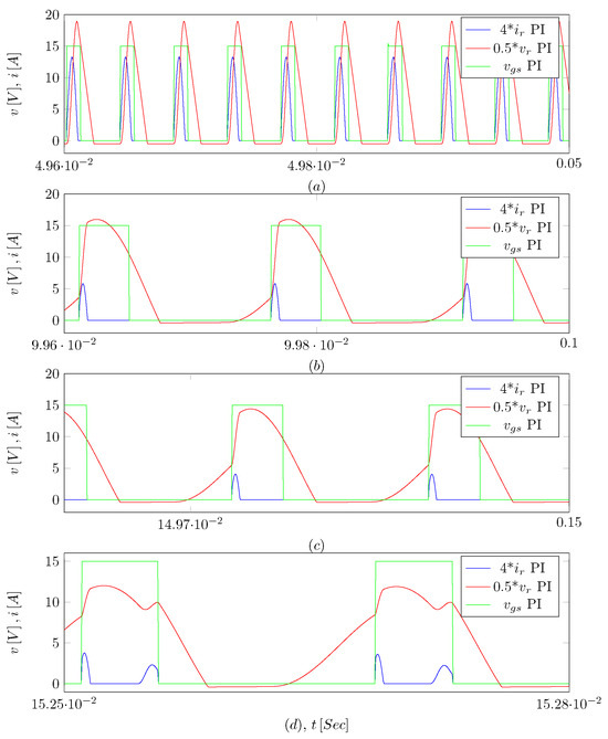 On the other hand, the corresponding behavior of the for this analysis is presented in Figure 8, where it can be observed that even for the lowest value (Figure 8d), in addition to the output voltage being regulated, the ZCS condition was satisfied. It must be noticed that the condition that remained at zero during the freewheeling operation mode did not hold due to the inclusion of the more realistic models during the numerical evaluation. From the previous results, it could be concluded that the controller improved the performance when the load resistance decreased, thereby increasing the robustness of the system by more than 50% of the value allowed by the controller.