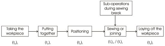 The technological sewing process consists of a series of technological operations that depend on the type, model, and use of the clothing. The structure of the sewing operation, shown in Figure 1, includes the necessary manual sub-operations—taking the workpiece, putting together, positioning, sub-operations during sewing breaks, sewing or joining, and laying off the workpiece—as well as the technological machine–hand sub-operation of sewing [6].