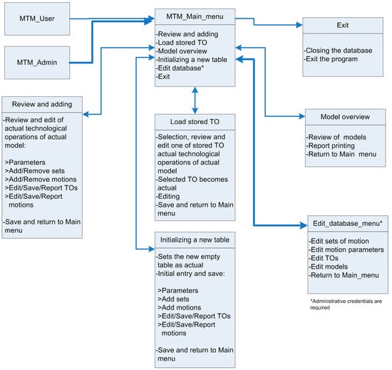 The process of developing the MTM Calculator v2.0 software ran parallel to the research on applying the MTM method in determining time norms within technological sewing operations in the clothing industry. The initial goal was to adapt the initially conceived measurement model to achieve a cyclical structure described by relational database tables. Relational databases still provide significantly faster and simpler searching and content maintenance than some modern hierarchical database systems. The first operational goal was to form tables of elementary movements and sets of movements. After that, it was necessary to devise ways of shaping, storing, and subsequently updating technological sewing operations. This segment constitutes the basic operational core of the application, which must enable the design of new technological operations, their quick and easy updating, the reusability of once designed technological operations, and the creation of reports and work orders for workers who need to perform the designed technological operations in practice. In the next step, the concept of a clothing model was introduced, which connects several technological operations into a single unit. Models for their realisation include a series of equal technological operations. This is where the reusability of once designed and stored technological operations comes to the fore. In the final part of the development, attention is focused on maintaining elementary sets (tables) of data, such as elementary assemblies, movements, and models of clothing items. MTM experts with administrative credentials intend to update this functionality. The flow diagram of the development activities coincides with the functional model of the MTM Calculator v2.0 software, as shown by the framework data flow diagram in Figure 2.