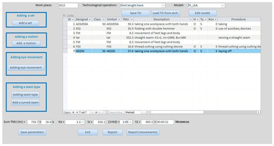 Since technological operations may consist of many sets of movements and basic movements, which must be calculated independently depending on parameters such as shape and type of movement, duration of movement, etc., it is possible to define the individual elements of the movement with the help of the software. In the column on the left side of the form, there are command buttons for adding specific elements for sets of movements, individual basic movements (which do not need to be calculated separately), eye movements, and special parameters used to calculate the time of the machine–hand sub-operation for sewing straight and curved seams (calculated with formulas). For the design and calculation of the execution time of technological operations, additional information is required, such as the workplace designation, the name of the technological operation, the name of the production model to which the specified technological operation is applied, the fatigue coefficient (Kn), the coefficient of environmental impact (Ka), and the coefficient of additional time (Kd).